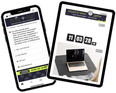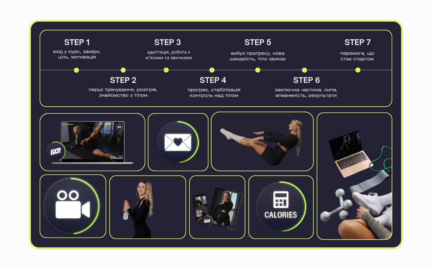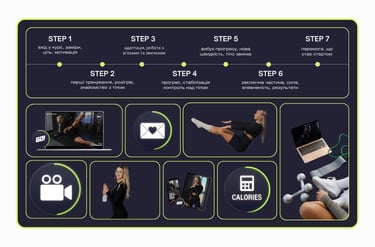Ми за стабільний і усвідомлений підхід, щоб тримати тебе в русі не один день, а довгий час. Кожен крок продуманий, має свою логіку, ритм і прогресію, щоб зміни були стабільними, здоровими та довготривалими.